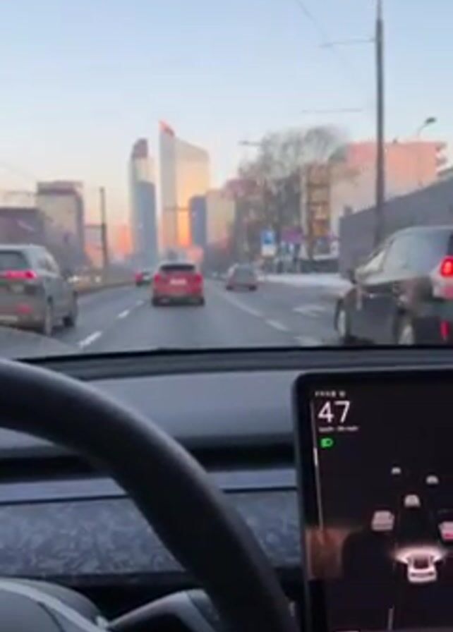 The view from the driver's seat of a car reveals an urban street scene with modern buildings in the background, visible through the windshield. Other cars are on the road, and the sky is clear. The steering wheel and dashboard of the car are visible, and the car's display screen shows the speed, song playing, and a diagram of the car's surroundings. The driver is on the road, moving with the flow of traffic.
