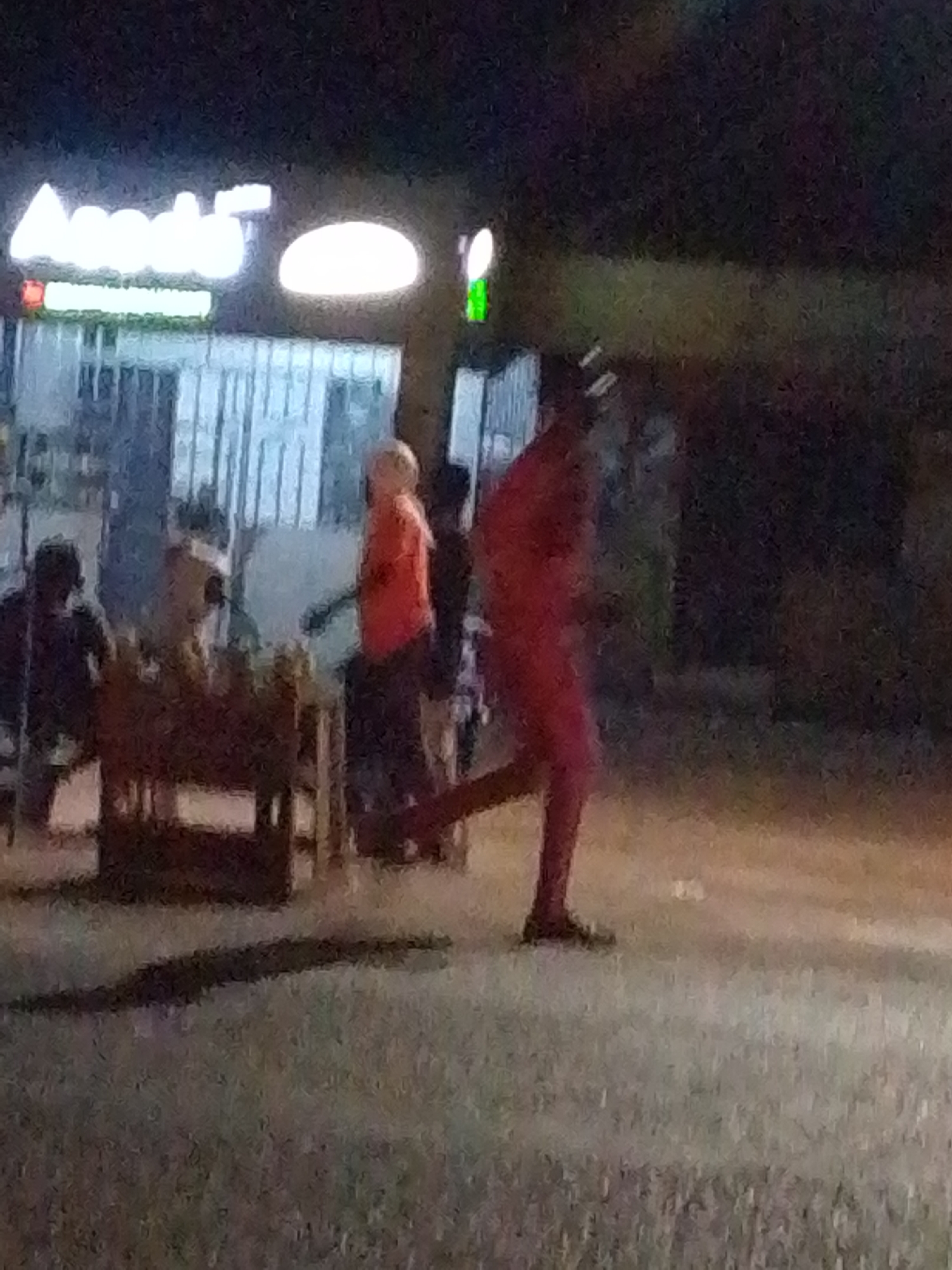 The scene is a night shot in Tamale, Ghana. A building with the sign "Angel's" is visible in the background. A fair-skinned person wearing an orange top and dark pants is standing in front of the building. Tables and chairs are set up outside the establishment, with people seated at them. A dark-skinned person wearing red clothing is walking towards the right side of the image. The ground is paved. The overall lighting is low, creating a dark environment.