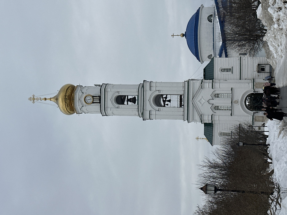 The image captures a winter scene at the Raifa Monastery in the settlement of Raifa, Russia. A prominent, tall, white multi-tiered Orthodox bell tower stands centrally, topped by a golden onion-shaped dome with a golden cross. Below the dome, a clock face displays black hands on a white background. Two open belfry archways, one above the other, house dark-colored bells. The base of the bell tower features a large, arched entrance, through which a group of approximately 10-15 individuals, clad in dark winter clothing, are actively moving. To the right of the bell tower, a portion of a white church building is visible, crowned with a distinctive blue onion-shaped dome and a golden cross. The ground is covered with substantial, uneven snow drifts along the sides of a cleared, dark pathway leading to the bell tower's archway. Bare deciduous trees and bushes line the pathway, and two dark, ornate streetlights are positioned on the left. The sky is uniformly overcast and grey. In the immediate left foreground, an individual walks towards the entrance, using two walking poles.