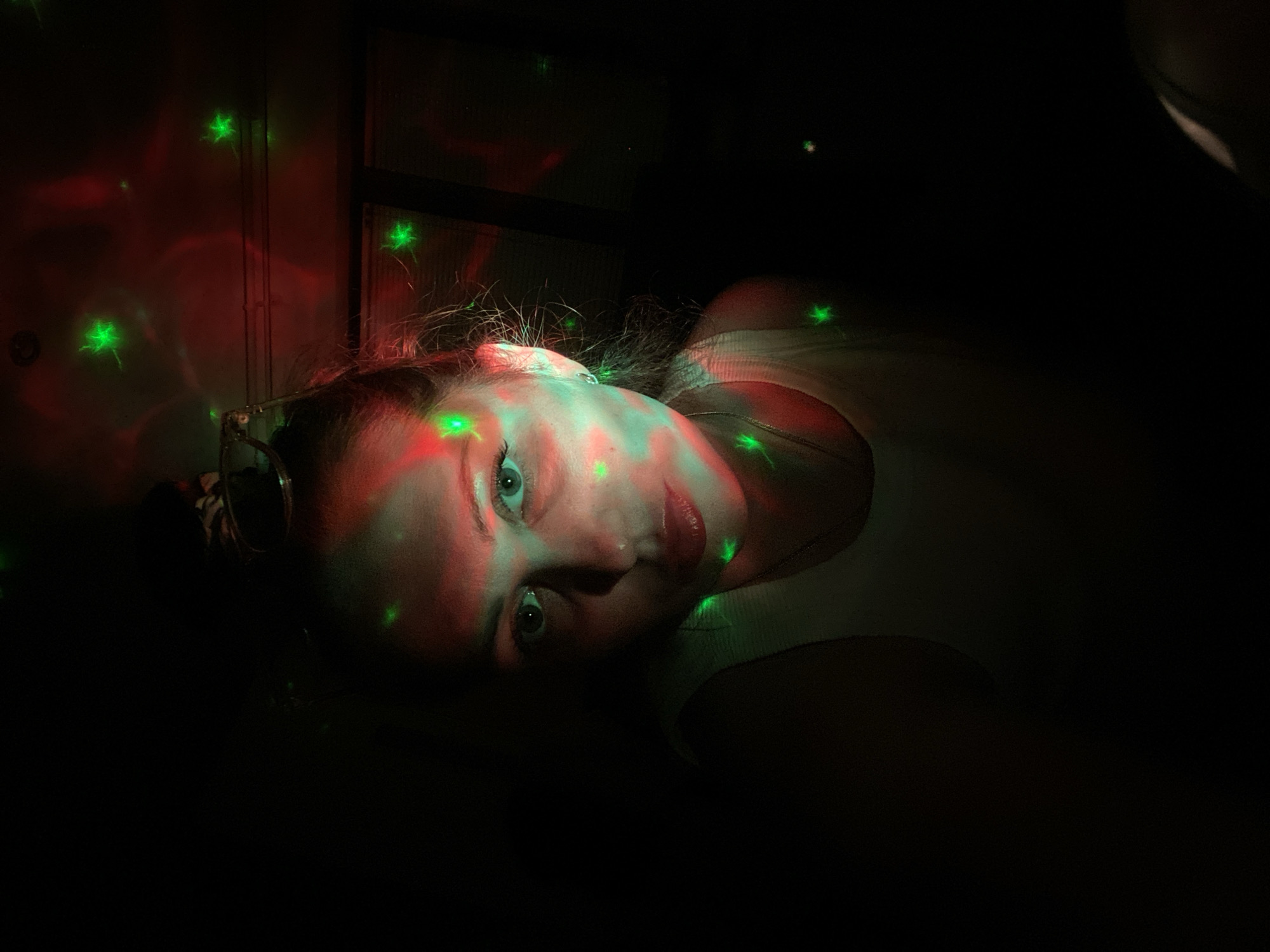 A photograph shows a woman lying down, her face tilted towards the camera. Her face is illuminated by red and green lights, which also project onto the wall behind her. She has fair skin, light eyes, and her hair is pulled back. Glasses are perched on her head. She is wearing a white tank top. The background is mostly dark. The location is not discernible based on visual data in the image.