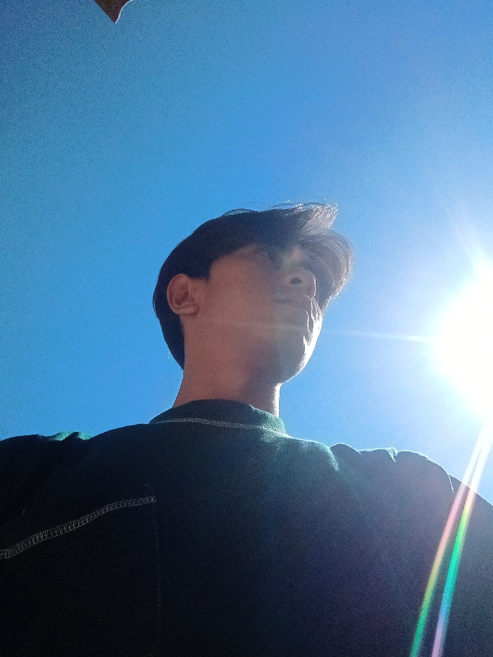 A male individual is depicted from a low-angle perspective, captured against a clear blue sky in Ciherang, Indonesia. He is positioned with his right profile partially illuminated, creating a slight silhouette effect. The subject has dark hair, styled with some volume on top, and wears a dark long-sleeved garment, possibly a sweater or shirt, featuring light-colored stitching details on the collar and shoulder seam. His head is tilted upward and slightly to his right, with his gaze directed away from the camera. A prominent sun flare is visible in the upper right portion of the frame, emitting intense light and producing discernible lens flare artifacts. A small, unidentifiable dark object is partially visible in the extreme upper left corner.