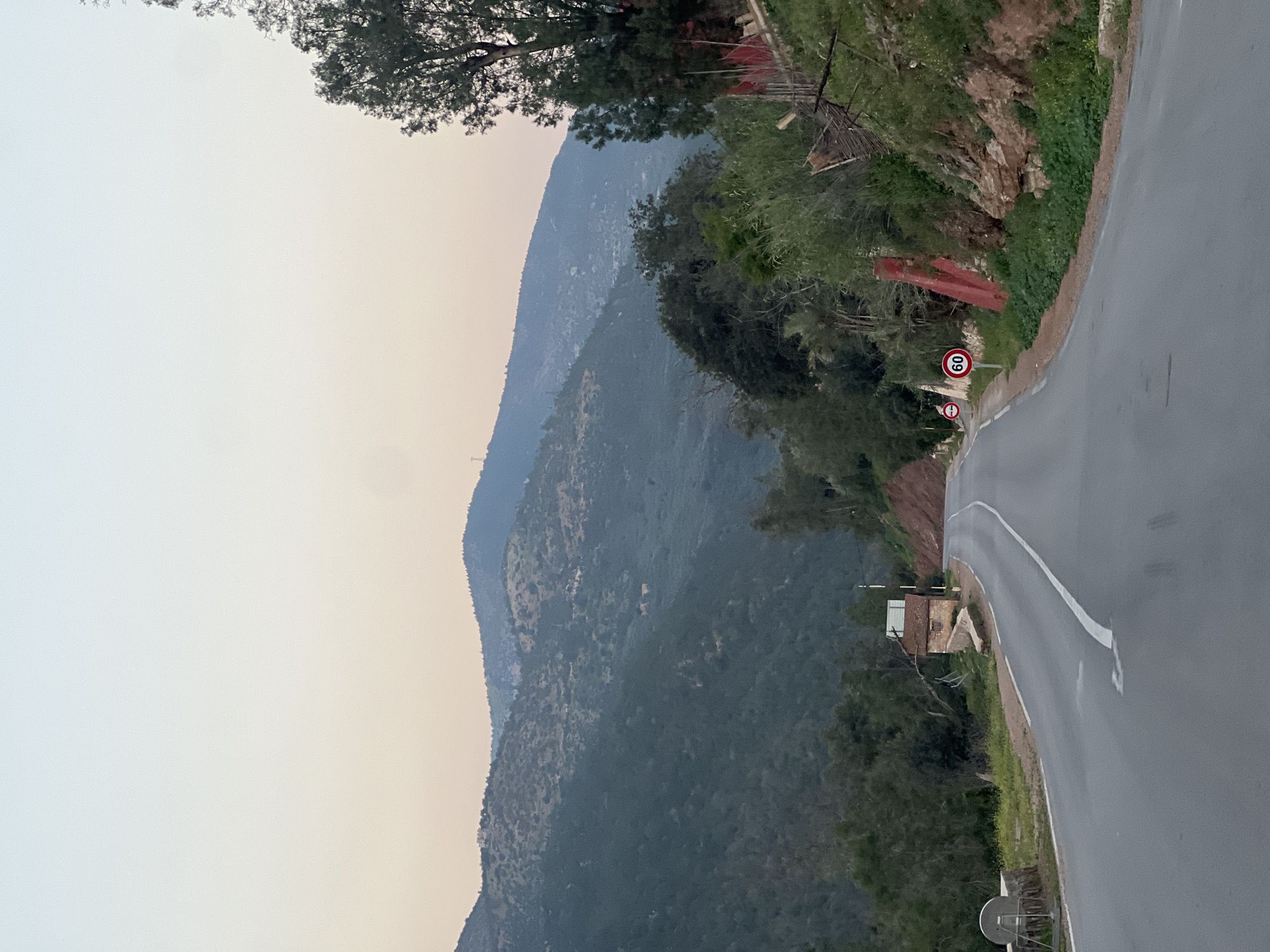 road winding through a mountainous landscape, possibly near Bin El Ouidane, Morocco. The road is asphalt, with a white dividing line, and has a sharp bend. A speed limit sign (60) is visible by the road. On the right side of the road is a rocky slope covered with vegetation. In the distance, a mountain range is visible, partially obscured by haze or smog. The sky is overcast. A small building is seen near the road, partially obscured by trees.