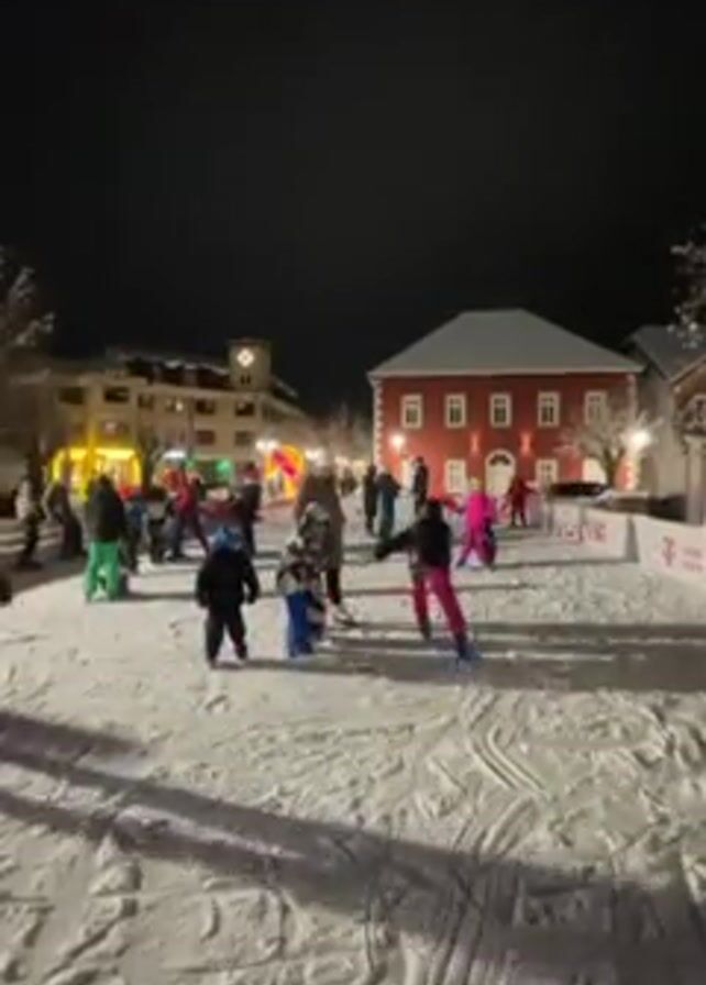 people ice skating at an outdoor rink. It is nighttime and there are lights illuminating the rink and surrounding buildings. People of various ages are skating, some are falling, and others are standing and watching. The ice is covered with skate marks. The buildings in the background appear to be shops and houses, decorated for the holidays. There is a white barrier with pink and black logos around the edge of the rink.