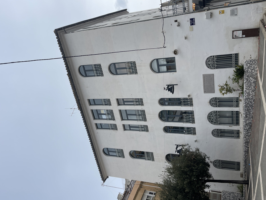 The image depicts a multi-story white building situated in a public square in Buñol, Spain