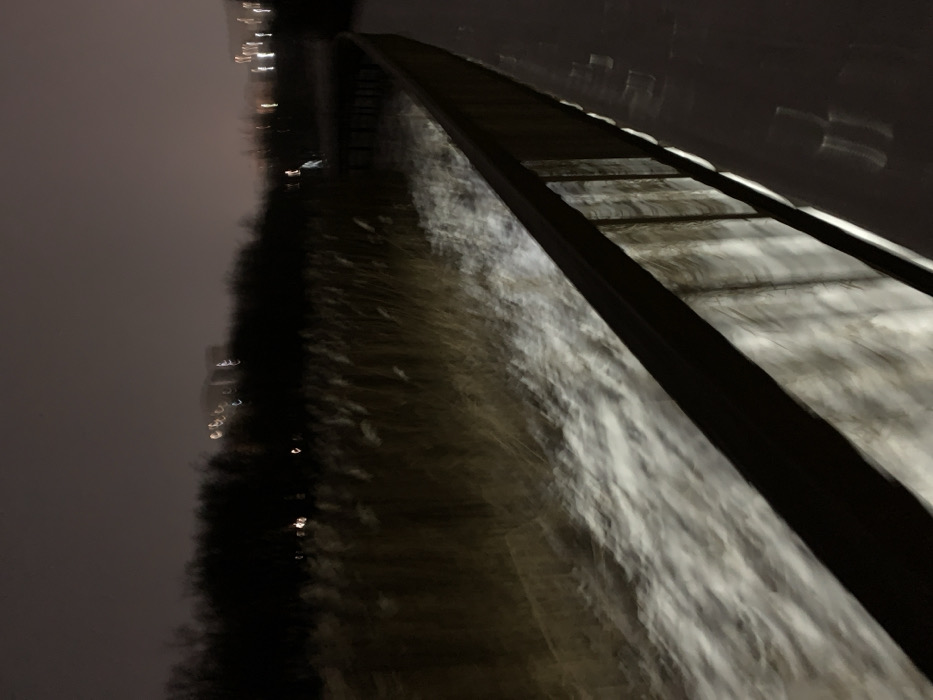 A blurred low-angle shot depicts a dark structure, possibly a dam or weir, with water cascading down its textured surface. Reflections shimmer across the water, hinting at lights in the distance. The overall image is dominated by shades of gray and black, conveying a sense of mystery and darkness, accentuated by the blur. The artificial structure and water blend together creating a sense of motion.