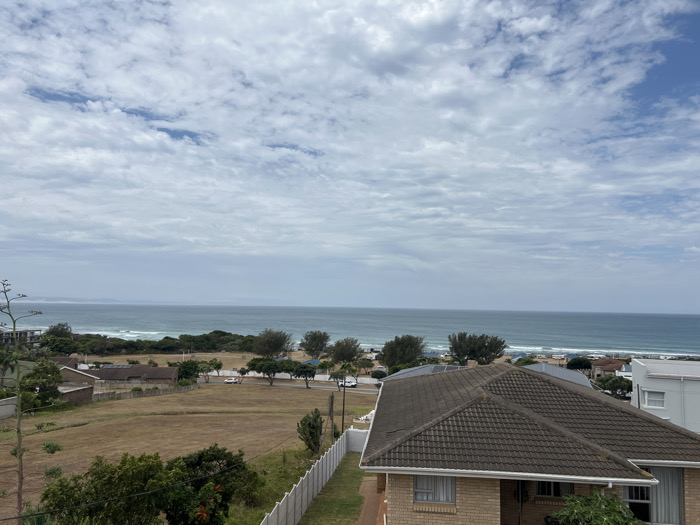 An elevated photograph captures a coastal landscape in Jeffrey's Bay, South Africa. The sky is partially cloudy, dominated by white and grey stratocumulus clouds with visible patches of blue. The Indian Ocean spans the mid-ground, displaying a light blue-grey hue with active breaking waves along the sandy shoreline. A strip of green coastal vegetation, comprising trees and bushes, runs parallel to the beach, behind which a paved road is visible. At least two vehicles, including a white sedan, are present on this road. Adjacent to the road on the left, an extensive field of dry, yellowish-brown grass extends inland. Within this field, towards the left, several low-lying structures with dark thatched roofs are discernible. In the foreground, primarily on the lower right, the dark brown tiled roof of a single-story brick residence with white gutters is prominent. The house features light brown brick walls. A light-colored fence defines a property boundary on the far right. Diverse foliage, including a tall, branched succulent-like plant on the far left, is scattered across the landscape. No human figures are visible within the frame.