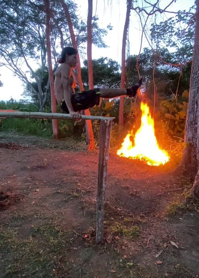 A man is doing calisthenics on a wooden bar in an outdoor setting. He is shirtless and wearing dark shorts. He is positioned on top of the bar, facing forward, and appears to be attempting a handstand or controlled movement. Behind him and to the right, there is a large fire burning on the ground. The environment appears to be a wooded area, with several trees visible. The sky is visible in the background and appears to be dusk or early evening. The ground is dirt and there is some low-lying vegetation visible.