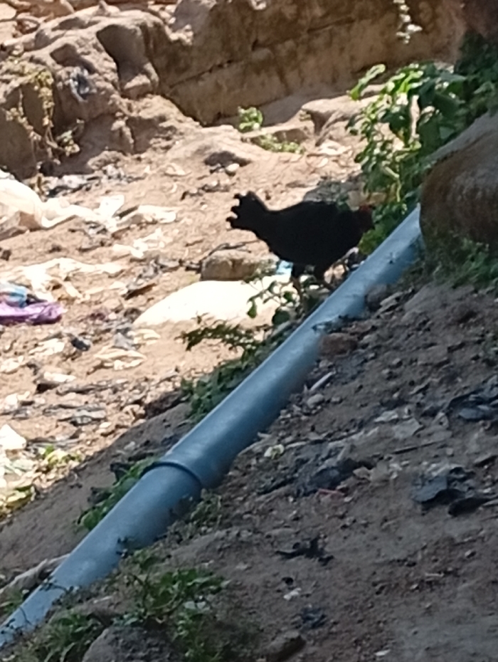 This image depicts an outdoor scene in Madalla, Nigeria. A dark-feathered fowl, likely a chicken, with a visible reddish comb and wattle, stands on a dirt slope. The fowl is positioned in the middle-right of the frame, facing left. A light-grey pipe, approximately six inches in diameter, traverses the slope diagonally from the lower-left to the mid-right. The ground consists of bare earth, small rocks, and sparse green vegetation. In the upper-left background, significant amounts of refuse, primarily white and colored plastic bags, are scattered across the dirt and rocky terrain, indicating a waste accumulation area. Larger rock formations are visible in the far background.