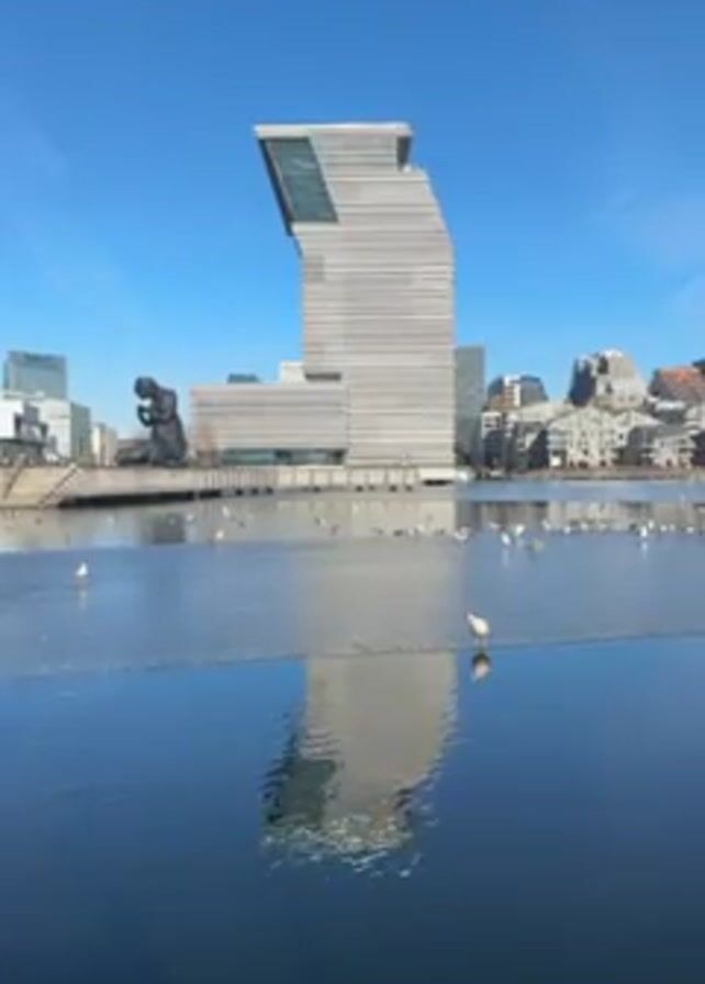 waterfront scene with a modern, angular building in the background, a sculpture of a seated figure to the left, and a flock of seagulls on a partly frozen body of water. The building is primarily white with horizontal stripes and an angled top section. Its reflection is clearly visible in the water. A dark sculpture of a kneeling figure is positioned near the water's edge. Seagulls are scattered on the partially frozen surface of the water, some standing still, others moving. The sky is clear and blue. Other buildings can be seen in the distant background. The video is taken from a static viewpoint.