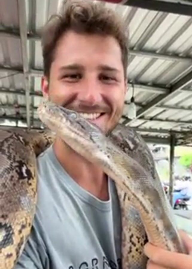 A fair-skinned man with short brown hair and a beard is holding a large snake around his neck
