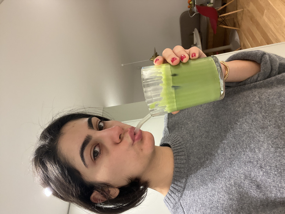 The image depicts a female individual indoors, likely within a residential setting in Porto, Portugal. The subject, with short dark hair, is wearing a grey knitted sweater and is looking directly at the camera. She holds a clear glass containing a green liquid with a frothy top layer and visible ice cubes in her right hand. Her right hand exhibits red nail polish and a gold-colored bracelet on the wrist. A clear straw is positioned in the glass and extends to her pursed lips, indicating active consumption of the beverage. The background features light-colored walls and a white ceiling with an illuminated fixture visible in the upper left. Further in the background, a curved, light-colored banquette, a circular table with a bowl of fruit, and a distinct red chair with wooden legs are visible. Portions of a light-colored wooden floor are also discernible.