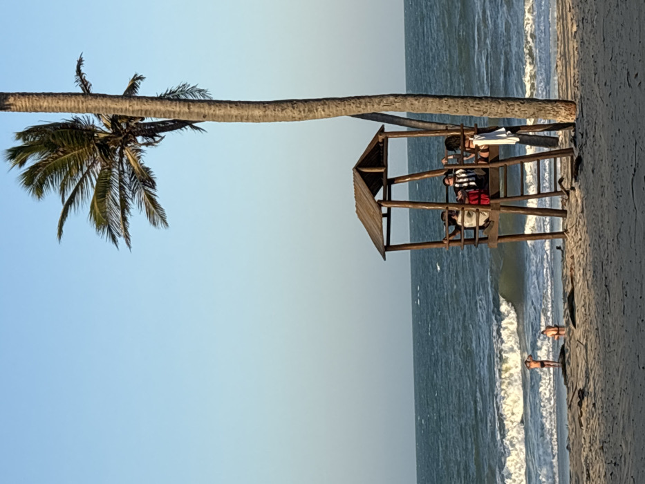 This image depicts a beach scene in Caucaia, Brazil, under a clear, light blue sky. The ocean, characterized by dark blue-green water and breaking white-capped waves, occupies the middle ground. The foreground consists of light brown sand. A tall, slender palm tree with green fronds is prominently positioned on the right side of the frame. Adjacent to it, a two-story wooden structure resembling a lifeguard or observation tower stands on the sand. This tower features a sloped, corrugated metal roof and wooden railings, with a ladder visible on its right side. Four individuals are present within the upper level of the wooden tower. From left to right: one individual wears a light-colored t-shirt, another wears a red and white striped shirt, a third wears a black and white striped shirt, and a fourth, partially obscured, has a white garment draped over the railing nearby. Their postures suggest observation or relaxation. Two additional individuals are visible closer to the water's edge. One individual, wearing dark swim trunks, stands upright in the shallow water, facing right with hands near their head. The second individual is positioned lower to the ground, possibly sitting or crouching, in the water to the right of the first.