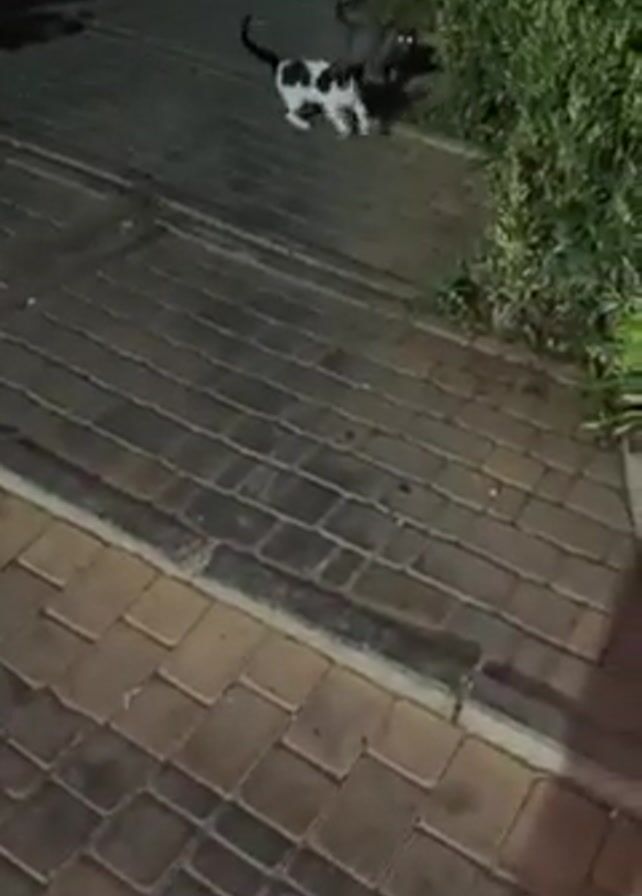 two cats outside at night on a brick walkway next to green shrubbery. One cat is black, and the other cat is black and white. A hissing sound is heard. The cats are walking.