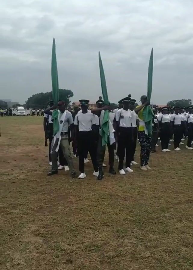 group of people standing on a grassy field. They are dressed in white shirts and black pants and are holding green flags. In front of them stands an individual in a black tracksuit, seemingly directing their movements. A larger group of people is visible in the background, along with vehicles. The sky is overcast.