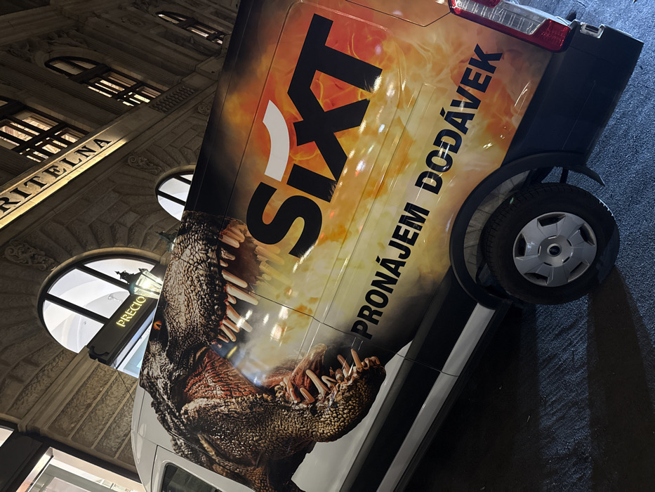A white commercial van, displaying a Sixt rental advertisement, is parked on a dark, reflective asphalt surface at night. The van's livery features a detailed graphic of a Tyrannosaurus Rex head with an open mouth and sharp teeth, transitioning into a fiery orange and yellow background. The "SIXT" logo in black and white is prominently visible, along with the Czech text "PRONÁJEM DODÁVEK" (Van Rental). The vehicle is positioned in front of a grand, multi-story stone building characterized by classical architectural details, including ornate carvings and large, internally illuminated arched windows. A partial sign on the building's facade reads "RITELNA," and below it, another sign displays "PRECIO" in white lettering above an arched entrance. A traditional lamppost with a glass enclosure hangs adjacent to the "PRECIO" sign. The ground is dark, appearing wet, and reflects ambient light. The scene is devoid of people or visible actions. This location is identified as Na Příkopě street in Prague, Czechia, consistent with the architectural style and visible signage.