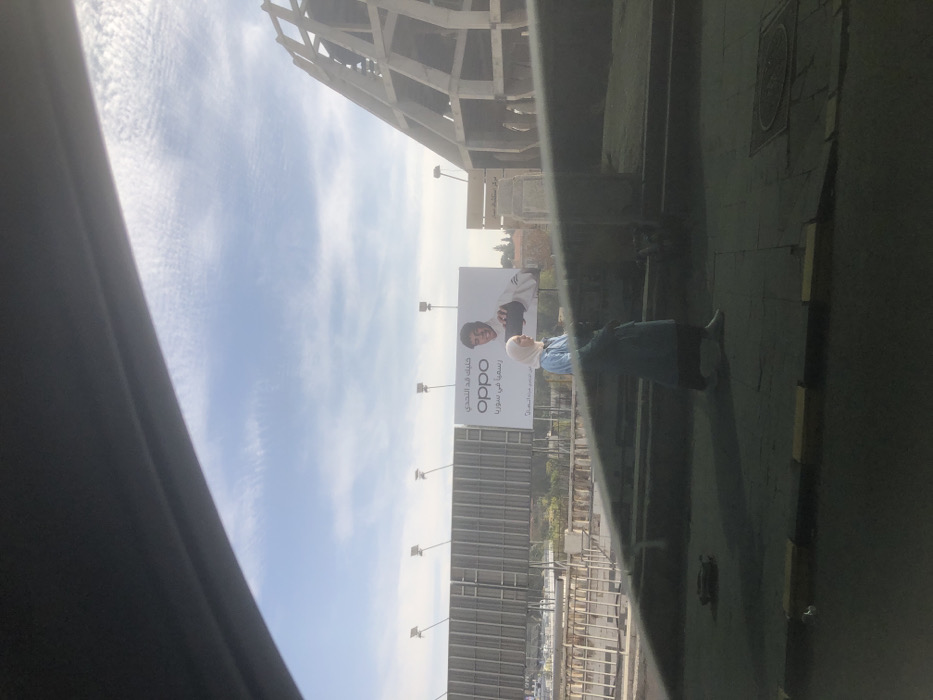 The image, taken from within a vehicle looking out through a slightly tinted window, depicts an urban environment within Al-Qanawat Municipality, Syria, under a bright, partly cloudy blue sky. In the mid-ground, a female individual walks from left to right on a paved sidewalk. She wears a light-colored hijab, a light blue long-sleeved tunic, and a dark long skirt, with light-colored shoes visible. Her head is turned slightly to her right. Behind her, a large white billboard prominently displays the "OPPO" logo, Arabic text translating to "Be up to the challenge" (خليك قد التحدي), and "Officially in Syria" (رسمياً في سوريا). The billboard features a smiling young male figure holding a white device. To the left of this billboard, the ribbed metallic back structure of another large billboard is visible. To the right of the OPPO billboard, a large, multi-faceted skeletal structure, composed of light-colored concrete or wood beams, rises against the sky, suggesting an unfinished construction or architectural design. Distant foliage and buildings are visible further in the background to the right. The immediate foreground shows a paved sidewalk with alternating yellow and black curb markings. A dark, indeterminate object lies on the sidewalk in the lower-left shadowed area, and a metal grate is visible on the sidewalk in the lower right. The scene is brightly lit by sunlight, casting shadows across the foreground.