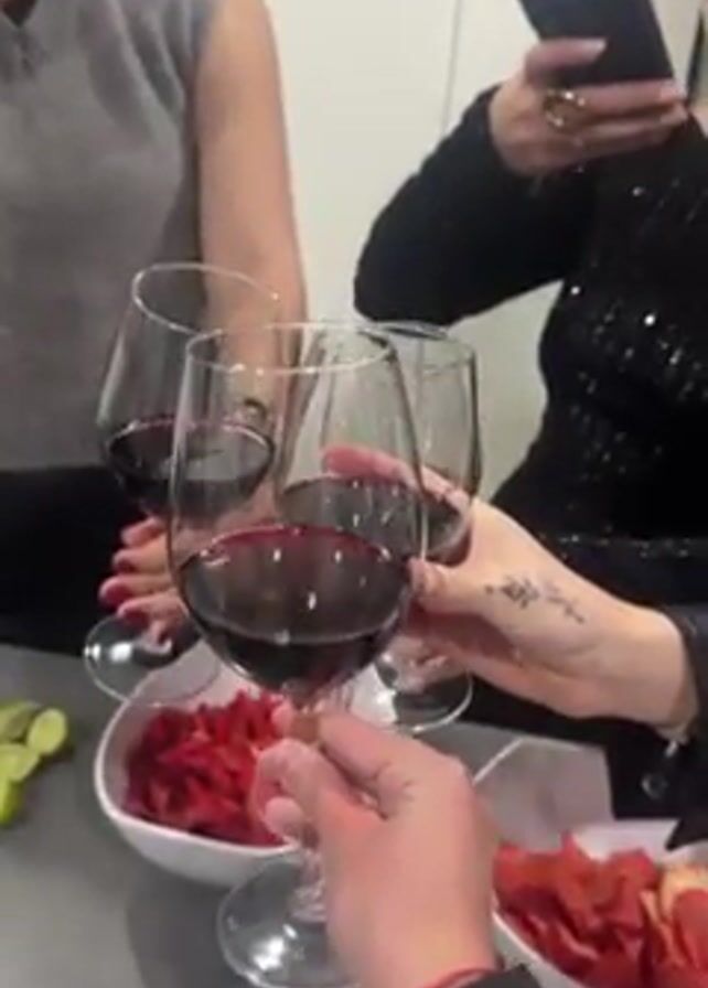 Four people are standing around a gray counter in what appears to be a kitchen. They are holding wine glasses filled with red wine, clinking them together in a toast. On the counter, there are two white bowls filled with red snacks that could be chips or other treats. There are also some green limes. Two of the people are holding up their phones, presumably taking pictures or recording videos of the toast. One person is wearing a gray sleeveless sweater, and another is wearing a black sequined top. The background is a plain white wall.