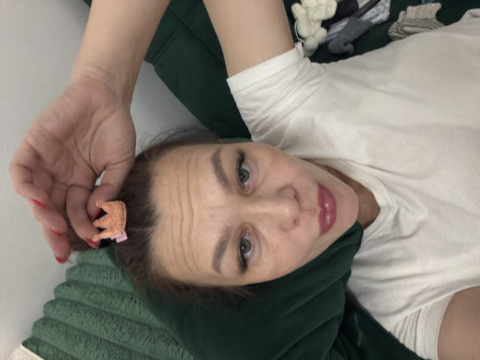 A woman with light skin, green eyes, and red lipstick is holding a gold crown hair clip. She is wearing a white t-shirt and appears to be lying on a green surface, possibly a pillow or couch. Her hair is brown. There are various items, possibly socks, in the background. She is looking directly at the camera.