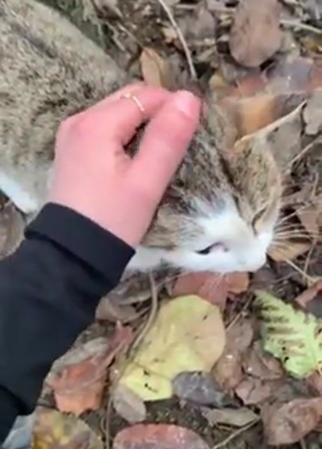 light-colored tabby cat with white markings being petted by a person wearing a black sleeve. The cat is standing on the ground, which is covered in fallen leaves and some patches of bare earth. The person pets the cat on its head and back. A tree trunk is visible in the background.
