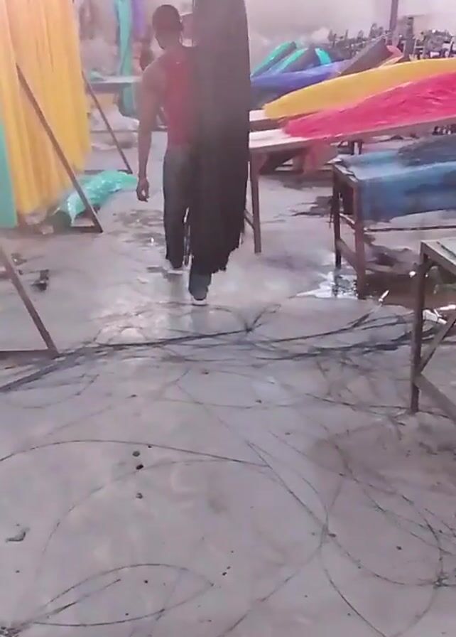 A man in a red tank top and grey pants is carrying a long piece of black fabric through a large, industrial-looking space. The floor is concrete and has streaks of water and dark debris. There are long tables covered in fabric of various colors including yellow, blue, pink, and green scattered throughout the room. There are also wooden frames leaning against the walls and on the floor. The room is well-lit with overhead fluorescent lights. The camera is stationary.