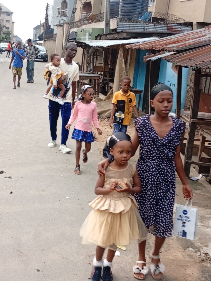A group of children of varying ages walks along a street. An older boy carries a toddler, followed by another young girl. A boy in a yellow shirt trails behind. In the foreground, a girl in a gold dress and another in a polka dot dress walk side-by-side, the older one carrying a shopping bag. The street is lined with buildings, some with corrugated metal roofs. Other people and vehicles are visible in the background.
