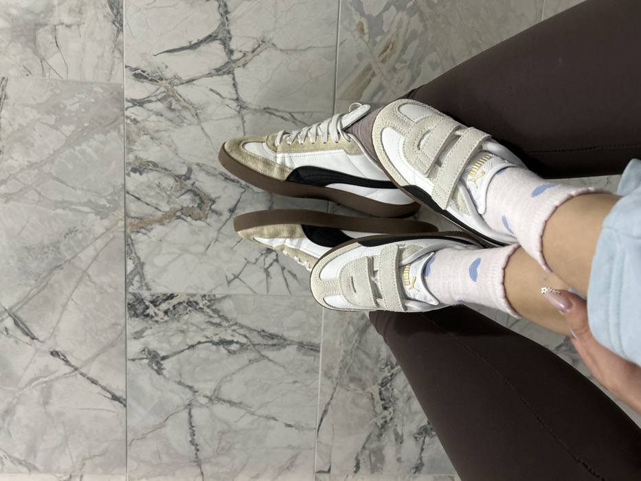 The image displays two pairs of feet positioned on a tiled floor. The flooring consists of large format, light-colored tiles with intricate grey and dark veining, resembling marble. On the right, an adult's legs are visible, wearing dark brown leggings and beige socks, with white Puma sneakers featuring black side stripes, white laces, and tan soles. On the left, a smaller pair of legs, also clad in dark brown leggings, wears light pink socks adorned with light blue heart patterns and child-sized white Puma sneakers. These child-sized sneakers have tan Velcro straps and tan soles. A hand with light-colored fingernails, featuring small dark patterns, is visible in the lower-left corner, resting on the smaller left leg, partially covered by a light blue garment. The specific location within Zlatograd, Bulgaria, is not discernible from the visual information presented.