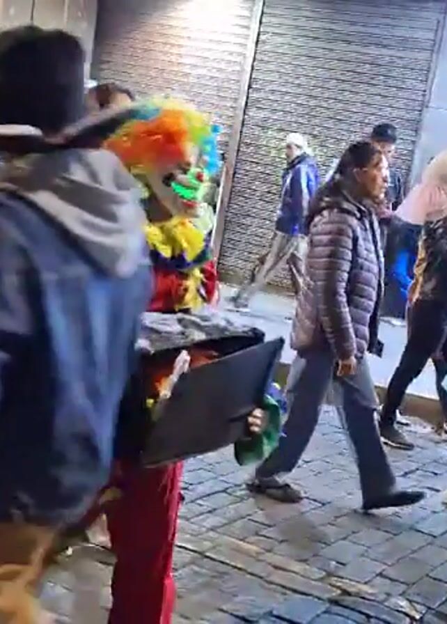 clown in a colorful costume with a rainbow-colored wig walking on a cobblestone street. The clown’s face is covered by a mask with glowing green eyes and teeth. The clown carries a black container with an unclear contents. The clown walks in the midst of other pedestrians, some of whom seem to be watching the clown. The environment appears to be a city street with buildings on either side.