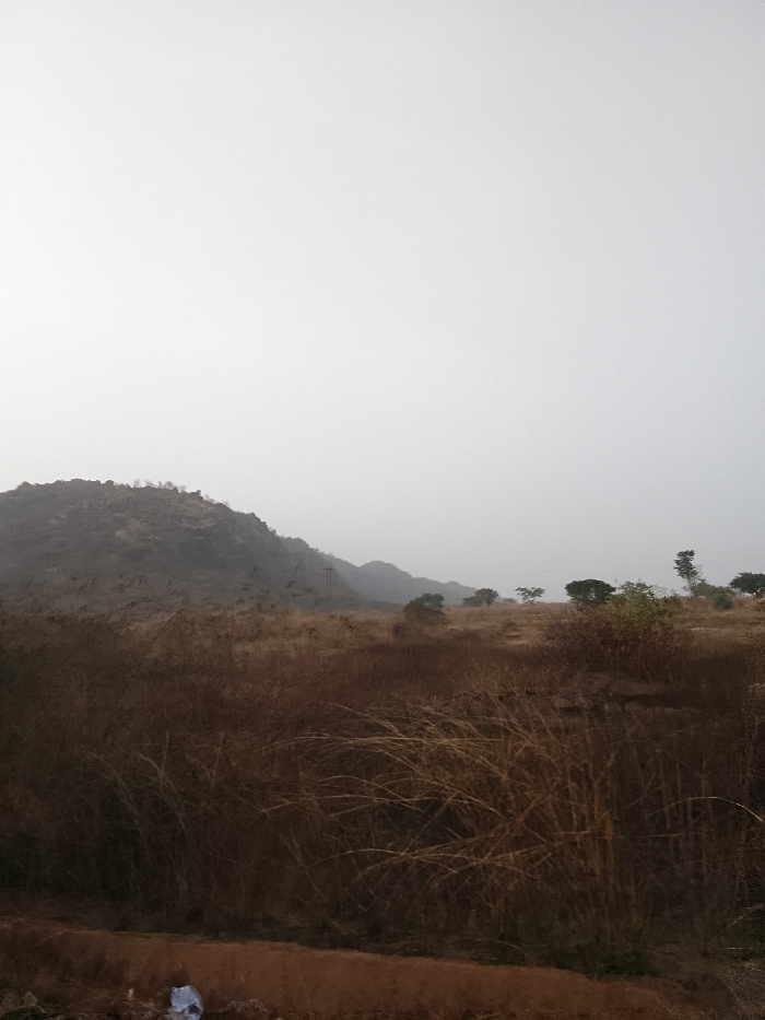 The image depicts a static, outdoor landscape scene in Mangu Halle, Nigeria, under a hazy, light grey sky