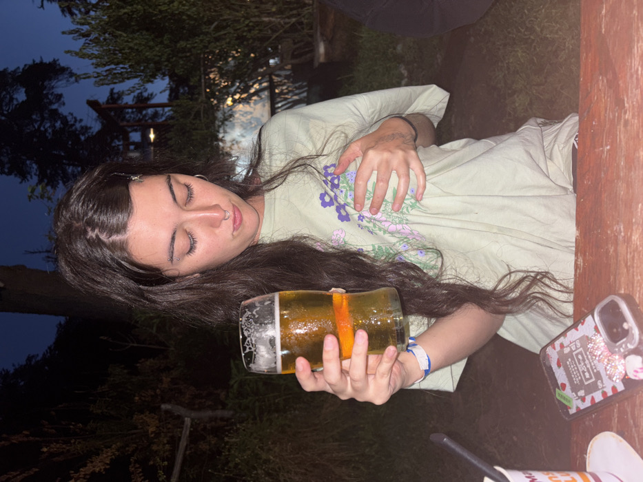 A young woman with dark hair and eyebrow piercings lies on her side outdoors. She holds a pint glass of beer with an orange slice. A light green T-shirt with purple floral pattern covers her torso. Part of a wooden table and a phone are visible on the right. The background includes trees and a hint of twilight sky.