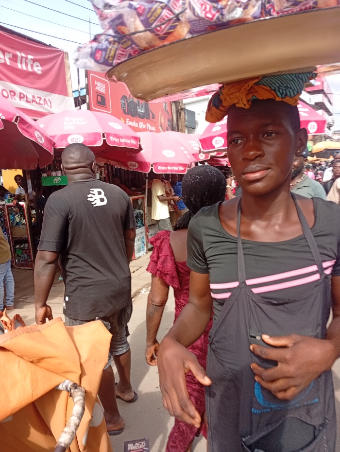 A young woman balances a tray of goods on her head in a bustling outdoor market