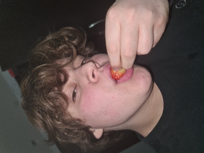A person's face is angled upward, with curly brown hair framing the face. A hand is placing a strawberry into the person's mouth. The skin is pale, with some visible freckles. The person wears a dark, solid-colored garment. The background is dark and somewhat indistinct, suggesting an indoor setting.