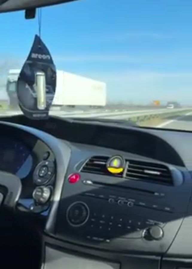 view from inside a car traveling on a highway. The sky is blue with few clouds. Several trucks are visible in front of the car, one of which is yellow with a sign in German or Dutch. The car’s dashboard is visible, including the steering wheel, radio, and air vents. An air freshener is hanging from the rearview mirror. The passenger is wearing ripped jeans. The road appears to be clear and the weather is sunny.