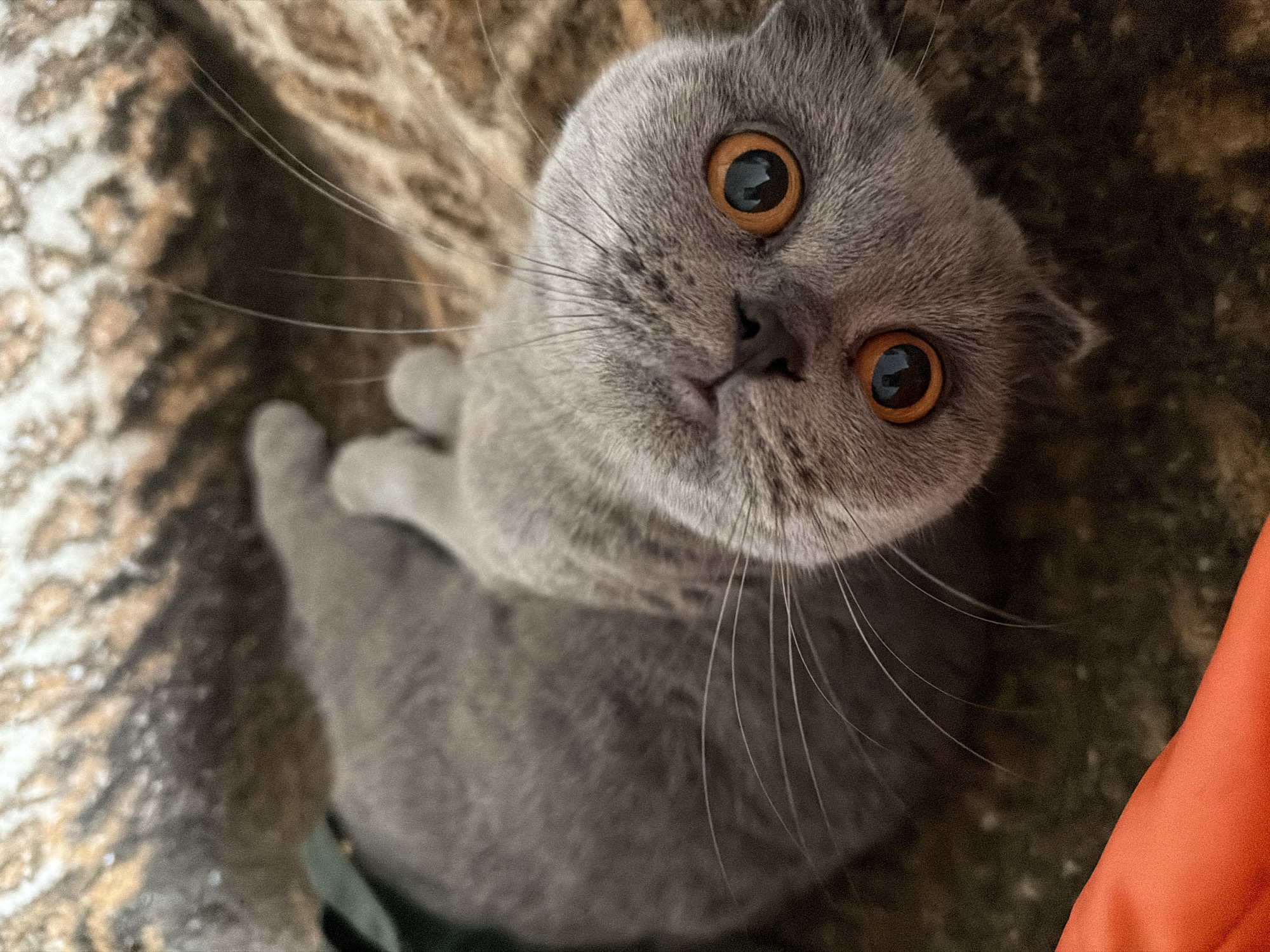 - "An indoor close-up photograph depicts a blue-gray domestic cat, appearing to be a British Shorthair breed, positioned on a textured surface" by FM-wHXkj2, licensed under CC BY 4.0
