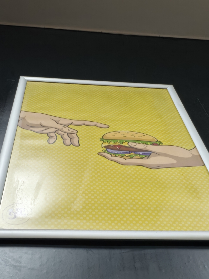 A rectangular print, housed in a light-colored, possibly aluminum, frame, is displayed at an angle against a dark, uniform background. The print features a pop art style illustration on a yellow background with a faint white polka-dot pattern. The illustration depicts two disembodied, cartoon-style hands. The hand on the left extends its index finger towards a hamburger held by the hand on the right. The hamburger, viewed in profile, consists of a sesame seed bun, a patty, green lettuce, red tomato slices, and purple onion rings. The interaction shown is reminiscent of Michelangelo's "The Creation of Adam," with the burger replacing a human figure. A faint, circular watermark or logo is visible in the bottom-left corner of the print. This framed image is located in Plovdiv, Bulgaria.