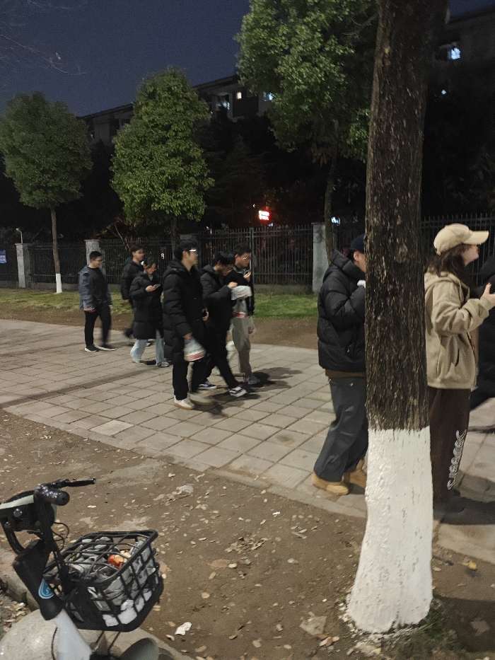 This image depicts an outdoor street scene at night within Shapingba District, China. Approximately ten individuals, primarily young adults, are walking on a paved sidewalk from left to right. Most are dressed in dark winter or cool-weather clothing, including puffer jackets and long coats. One person on the far left wears a dark jacket. A female in a dark long coat is visible looking at a mobile phone. Another male in a dark puffer jacket, wearing glasses, carries a white bag. Further to the right, partially obscured by a tree, a male wears a dark puffer jacket, dark pants, and light brown boots. A female, also partially obscured, wears a beige hoodie, brown pants, and a beige baseball cap, appearing to hold a phone. In the immediate foreground on the left, a grey or white shared bicycle is parked on an unpaved, debris-strewn dirt strip adjacent to the sidewalk. Its front basket, made of black wire, contains several items, including a reddish-orange object and some white packaging. A prominent tree with a dark, textured trunk stands in the right foreground, its base painted white approximately one-third of the way up. In the background, beyond a dark metal fence, several green-leafed trees are visible, and behind them, dark buildings with a few illuminated windows can be seen. A faint red illuminated sign is discernible in the distance beyond the fence. The overall lighting suggests dusk or nighttime conditions.