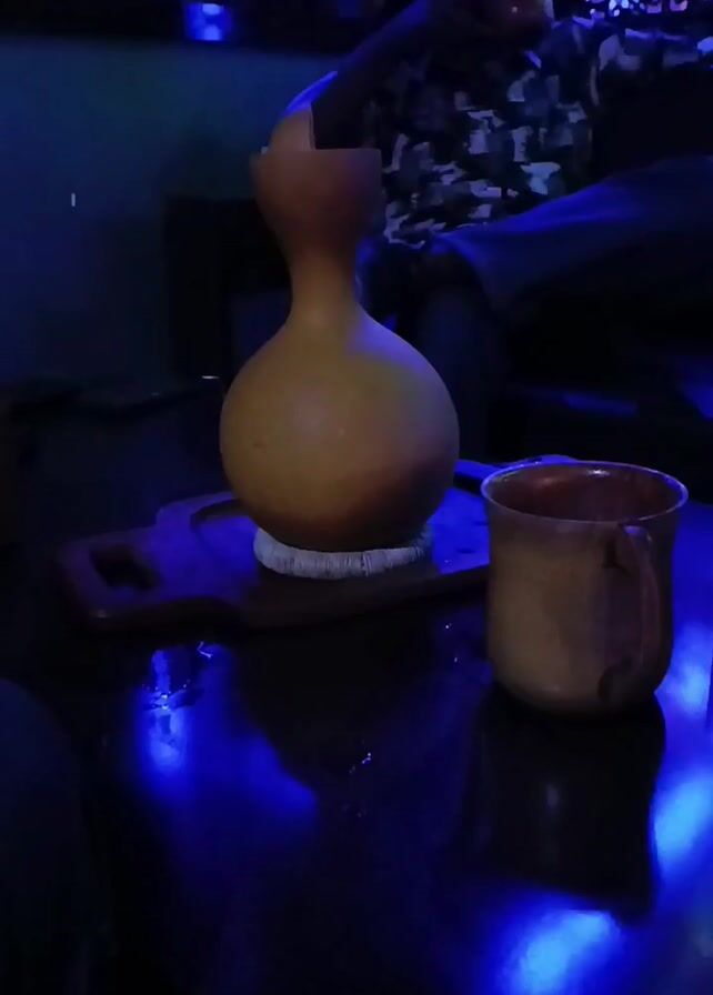 The video opens with a low-angle shot of a shiny black table with a gourd on a wooden board and a ceramic mug. The lighting is primarily blue, with some purple hues. A person is seated in the background, wearing a cap and patterned clothing, appearing to drink from a container. The camera then tilts upwards, revealing blue and purple LED strip lighting, and a mirrored ceiling above the person, reflecting a scene with green laser lights and artwork. A second, blurry figure is also visible in the mirror. The audio includes music.
