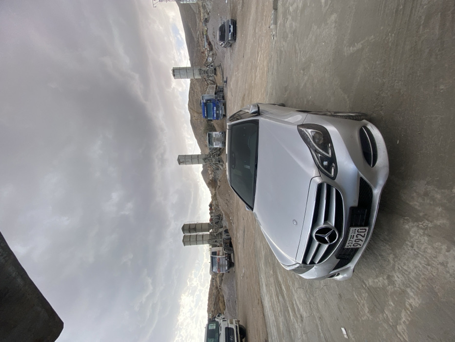 The image depicts an outdoor industrial scene located in Dahiyat Harasta, Syria, under an overcast sky. In the immediate foreground, a silver Mercedes-Benz E-Class sedan (W212 facelift) is parked facing the viewer at a slight angle to the right. The Syrian license plate, "537 SYR 9920", is clearly visible on the front bumper. The ground beneath the vehicle is uneven, consisting of packed dirt and concrete. In the mid-ground, an active or recently active aggregate processing or concrete batching plant is visible. This includes multiple tall, cylindrical structures, likely cement silos or aggregate hoppers, arranged in two distinct pairs. Surrounding these structures are large piles of various aggregates, such as sand and gravel. Several heavy vehicles are present: a white utility truck is partially visible on the far left, another white truck (possibly a concrete mixer) is positioned behind the left pair of silos, and a blue dump truck is to the right of this pair. A second white truck is visible further right, near the second pair of silos. A dark-colored sedan is parked further back on the right side of the scene. The background consists of arid, rocky hills or mountains under a heavily clouded, grey sky. No individuals are visible, and no actions or interactions are depicted; all vehicles appear stationary. A power line pylon or structure is partially visible on the far right.