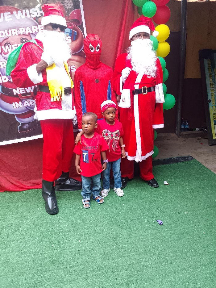 The scene is located in Agani, Nigeria. The image displays five individuals posing for a photograph on a green artificial turf surface, likely outdoors. From left to right, the individuals are: 1. An adult male dressed as Santa Claus, wearing a red suit with white trim, black boots, a white beard, a red hat, and dark sunglasses. He holds a yellow object, possibly gloves or a scarf, in his right hand and has a green shoulder bag. 2. An adult male fully encased in a red and blue Spiderman costume, including a full head mask. 3. A young boy, appearing to be 3-5 years old, wearing a red t-shirt with "DANGER 777" printed in white, blue jeans, and grey sandals with blue accents. He stands with his left arm around the shoulder of the girl to his right. 4. A young girl, appearing to be 3-5 years old, wearing a red t-shirt with a white and red decorative design, blue jeans, white sandals, and a red headband. Her left hand rests on the boy's left shoulder. 5. An adult male dressed as Santa Claus, wearing a red suit with white trim, black dress shoes, a white beard, a red hat, and eyeglasses. He holds a small white pouch with a red design in his left hand. The background features a large, partially visible banner on the left, depicting a cartoon Santa and fragments of text including "WE WISH...", "YOUR PARE...", and "NEW... IN AD...". A red fabric drape is behind the banner. To the right, a vertical stack of green, red, and yellow balloons is present. Further right, a partially visible sign reads "MAJESTY CHURCH OF THE LIVING GOD HEAD". Two plastic water bottles are visible on the ground behind the balloons. Two small, indistinct objects, one purple and one white, are on the green turf near the feet of the rightmost Santa. The lighting indicates daylight conditions.