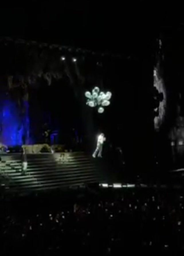 The video captures a live concert performance from the audience's perspective. The stage, partially illuminated, features a performer dressed in a white shirt and sparkly silver pants. He is suspended in the air, seemingly attached to a cluster of white balloons. The stage setup includes tiered steps, band equipment to the side, and backdrop designs suggesting a cavernous environment. The audience, discernible as a mass of people, are holding up their phones, presumably recording the performance. The overall lighting is dim, with spotlights focusing on the performer.