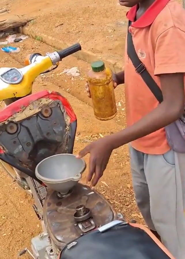 A young person in an orange collared shirt and gray pants pours liquid from a clear plastic jar with a green lid into a motorcycle gas tank using a funnel. The motorcycle has a yellow and white front, with a worn red and black seat. The person is standing on a dirt ground next to a street curb. There is a partial view of people in the background.