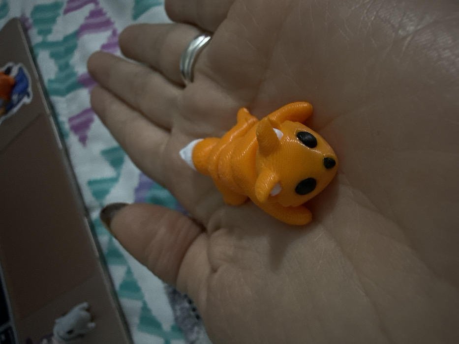 A hand holds a small, orange, 3D-printed fox figure with black eyes and a white-tipped tail. The hand is adorned with a silver ring. The background shows part of a laptop with stickers and a patterned blanket. The fox is the focal point, resting securely in the palm.