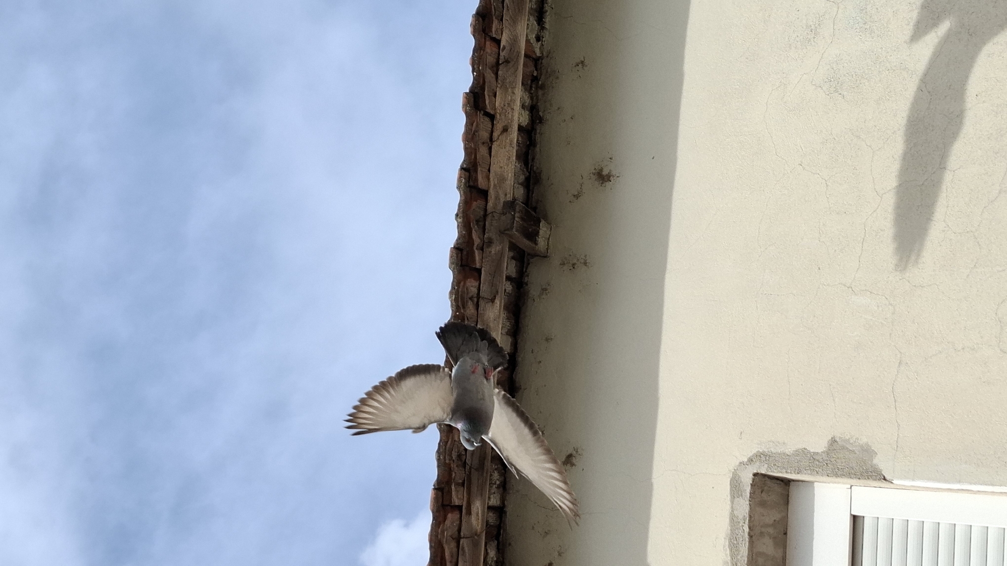 A grey pigeon is captured in mid-flight against a light blue, partly cloudy sky above an urban building in Trebinje, Bosnia and Herzegovina. The pigeon, positioned with wings outstretched, displays white and dark grey primary feathers, a grey body, and a reddish mark on its lower abdomen. Below the sky, the building's eave features a roof constructed of weathered reddish-brown terracotta tiles, with visible, aged wooden support beams. The wall beneath the roofline is light beige stucco, exhibiting a network of fine cracks, localized staining, and evidence of previous repair work. A portion of a window, equipped with closed white roller shutters, is visible in the lower-left corner of the frame, set within a stucco or concrete frame. A distinct, dark, irregular shadow is cast onto the lower-right section of the stucco wall, with a fainter, elongated shadow located higher on the same wall surface.