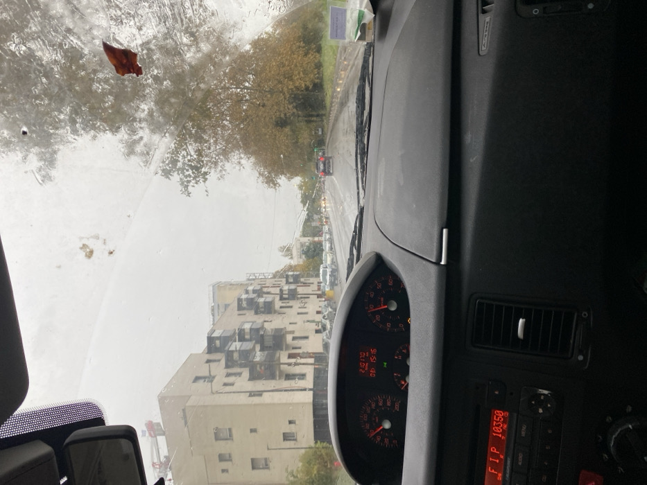 The image depicts a street scene viewed from the interior of a vehicle, looking forward through a wet and somewhat dirty windshield