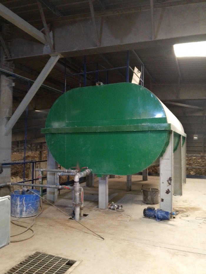 large, green, cylindrical tank in a factory setting. The tank has a cylindrical bottom and a curved top. There are four steel support columns extending from the bottom of the tank. The tank appears to be resting in a concrete area, with a metal grate in the foreground. Several pipes and valves can be seen under the tank, connecting to the steel support columns. There is a blue bucket in the foreground, and a smaller bucket and a blue electric motor are visible in the background. The location of the scene is a factory in Pangasia, Bangladesh, based on the provided coordinates (latitude: 22.693, longitude: 90.601). There are no people in the image.