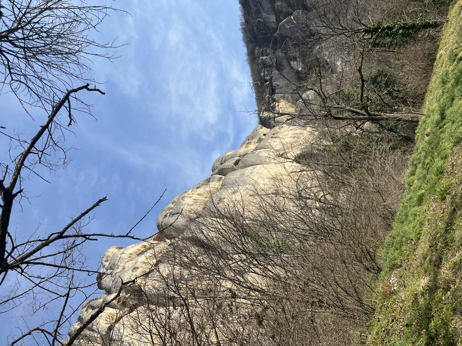 The scene depicts a natural rock formation in Madara, Bulgaria, under a clear blue sky with scattered cirrus clouds. Dominating the left and center of the frame is a massive, light-colored limestone cliff face, exhibiting rounded and weathered features, illuminated by sunlight from the left, casting shadows that highlight its contours. In the foreground, a grassy slope with patches of green and brown foliage rises from the bottom left, transitioning into dense, leafless deciduous trees and shrubs that obscure the lower sections of the cliff. Bare tree branches with fine twigs are visible across the upper portion of the sky, framing the view. Towards the right and further back, additional rock formations with darker, shadowed surfaces and more sparse vegetation are visible. No individuals or active subjects are present.