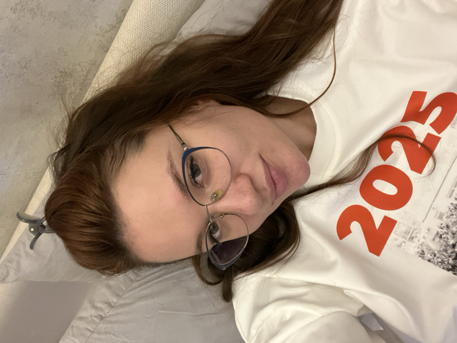 A woman lies on her back, facing the camera. She wears eyeglasses with blue frames and a white sweatshirt imprinted with the year "2025" in large, red lettering. Her brown hair is loose, with a hair clip visible near her head. The background consists of a textured wall and a gray bed sheet. She appears relaxed, looking directly at the camera with a slight smile.