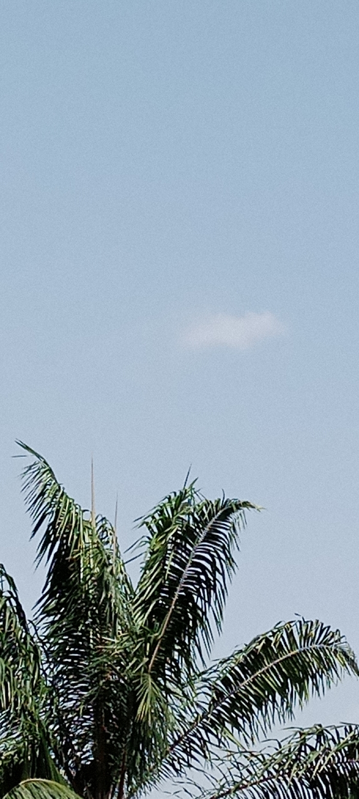 A vertical composition depicts the upper section of a palm tree against a clear, light blue sky, observed in Tuaniako, Nigeria. The top two-thirds of the image consist of the sky, with a single, small, indistinct white cloud situated centrally in the upper half. The lower third of the image is dominated by the dark green fronds of a palm tree, extending upwards and outwards from the bottom edge. Two slender, light brown, spear-like growths, likely new fronds, protrude vertically from the central crown of the tree. No individuals, animals, or man-made structures are visible. The scene suggests an outdoor, daylight environment with clear atmospheric conditions.