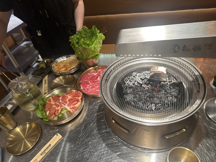A dining table holds a Korean BBQ setup