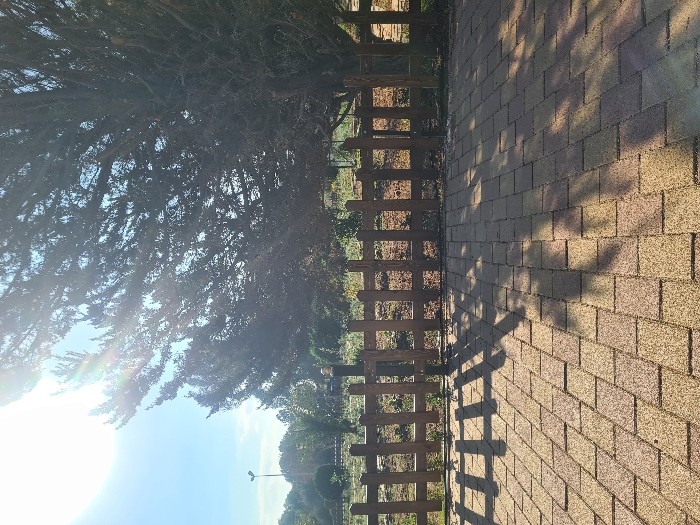 A sideways view depicts a landscape featuring a tree shading a brick-paved ground. A rustic, wooden fence runs parallel to the paved area, delineating the space. Beyond the fence, greenery suggests a garden or natural environment. The sky is visible, contributing to a bright, outdoor atmosphere. The sun's glare adds a visual element, highlighting the contrast between light and shadow.