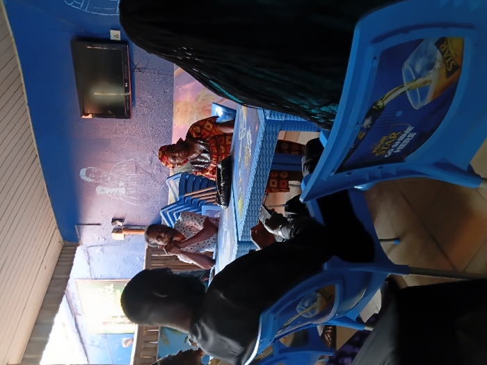Inside a blue-themed bar, several people are seated at tables with blue plastic chairs. One woman wears a patterned headscarf and top. Another woman in a white and pink shirt sits next to her. A person in a black shirt is also at the table, using a smartphone. A television is mounted on the blue wall, and there's a drawing of a person on the wall as well. "Star" is printed on the blue plastic chairs.